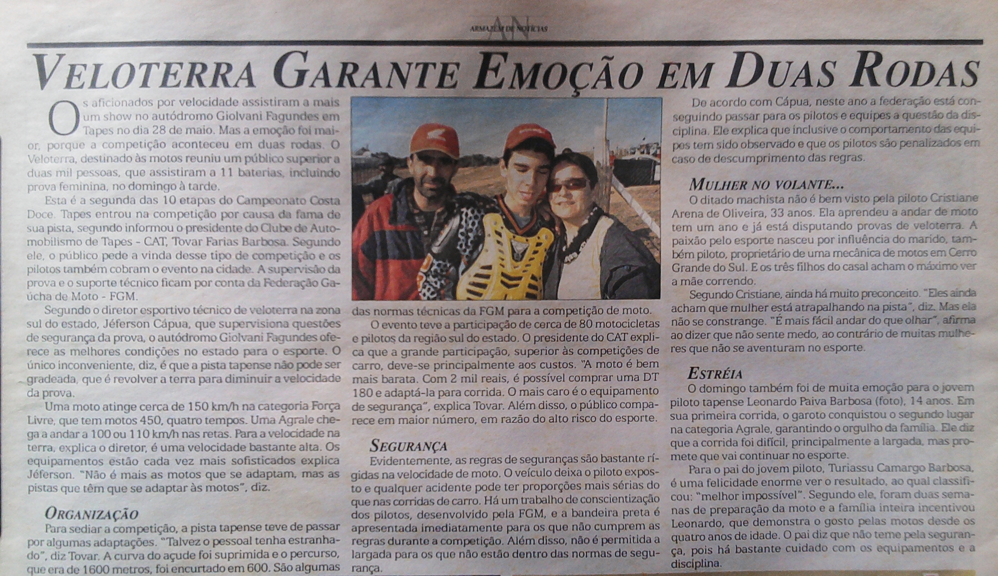 Veloterra garante emoção em duas rodas Matéria sobre automobilismo, publicada no Jornal Armazém de Notícias em maio de 2006. Posted in Jornal.